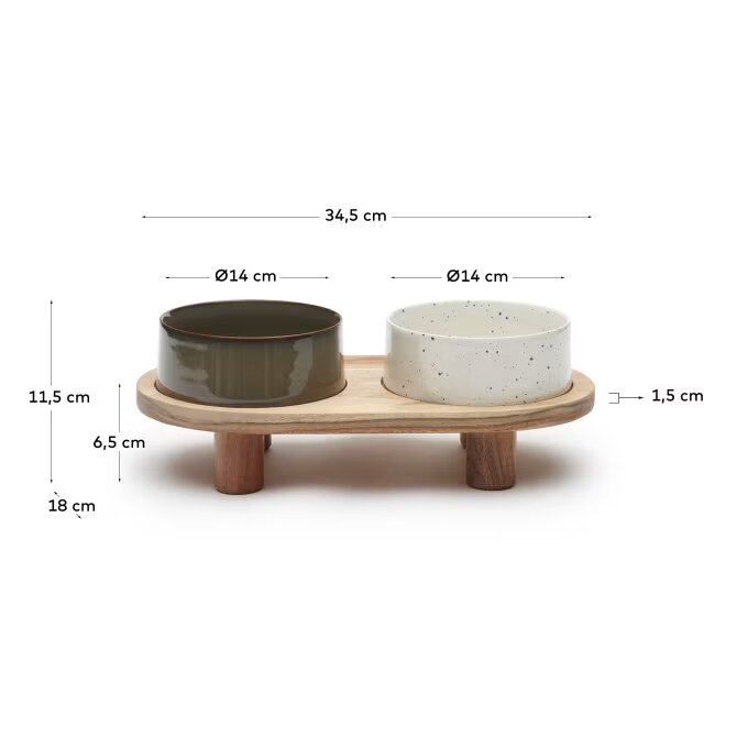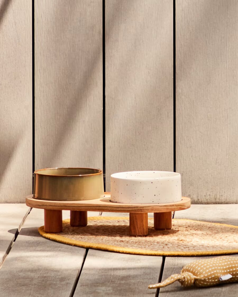 Comedero elevado de diseño moderno, con cuencos de cerámica y base de madera natural resistente. Ideal para facilitar la postura de tu mascota al comer y beber, reduciendo la tensión en sus articulaciones. Los materiales de alta calidad son duraderos y fáciles de limpiar, combinando funcionalidad y estilo en un accesorio perfecto para cualquier hogar.